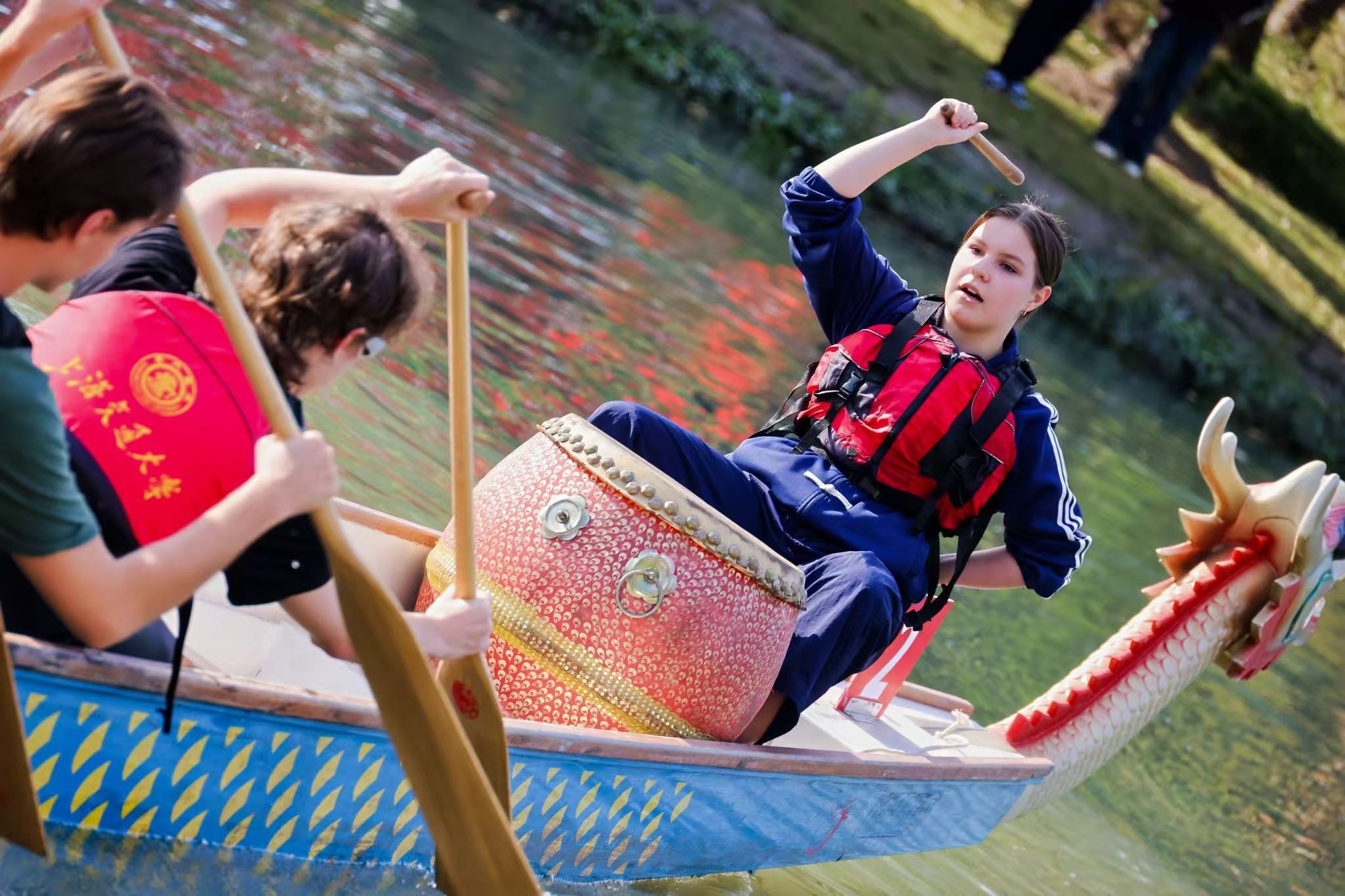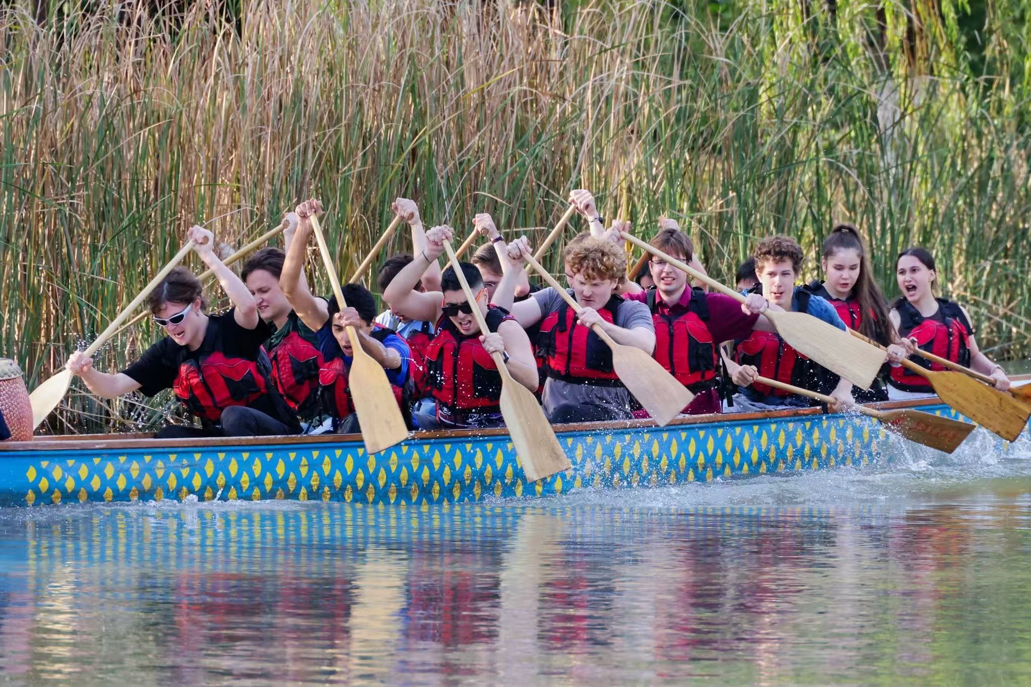 On the dragon boat, the drumbeats were particularly intense: "Boom! Boom! Boom!" The team members worked together, racing against time toward the finish line. The paddles sliced through the water on both sides, and the dragon boat sped forward like a rocket beneath the reeds, as if a dragon were soaring with overwhelming momentum.
