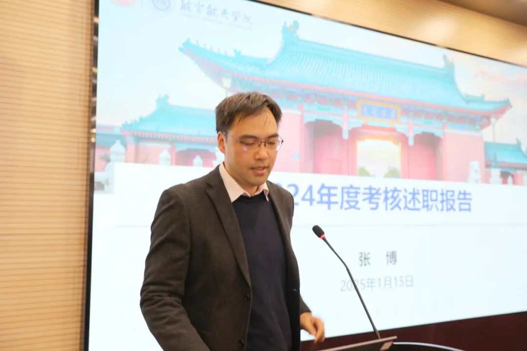 校人力资源处副处长朱晓岚主持院领导班子及正职考核测评。胡士强代表院班子作工作述职。报告总结了学院2024年度各项工作进展。与巴基斯坦合作研制世界首颗探月纳卫星,搭载嫦娥六号完成任务,受到党和国家领导人接见,入选交大“十大科技进展”。教师获交大教书育人一等奖、就业引导名师、上海青教赛一等奖等荣誉。荣获就业质量卓越奖、国创赛金奖。青年教师获批海优、白玉兰、超博人才计划十余项。结合未来发展目标,报告对2025年重点工作进行部署。
