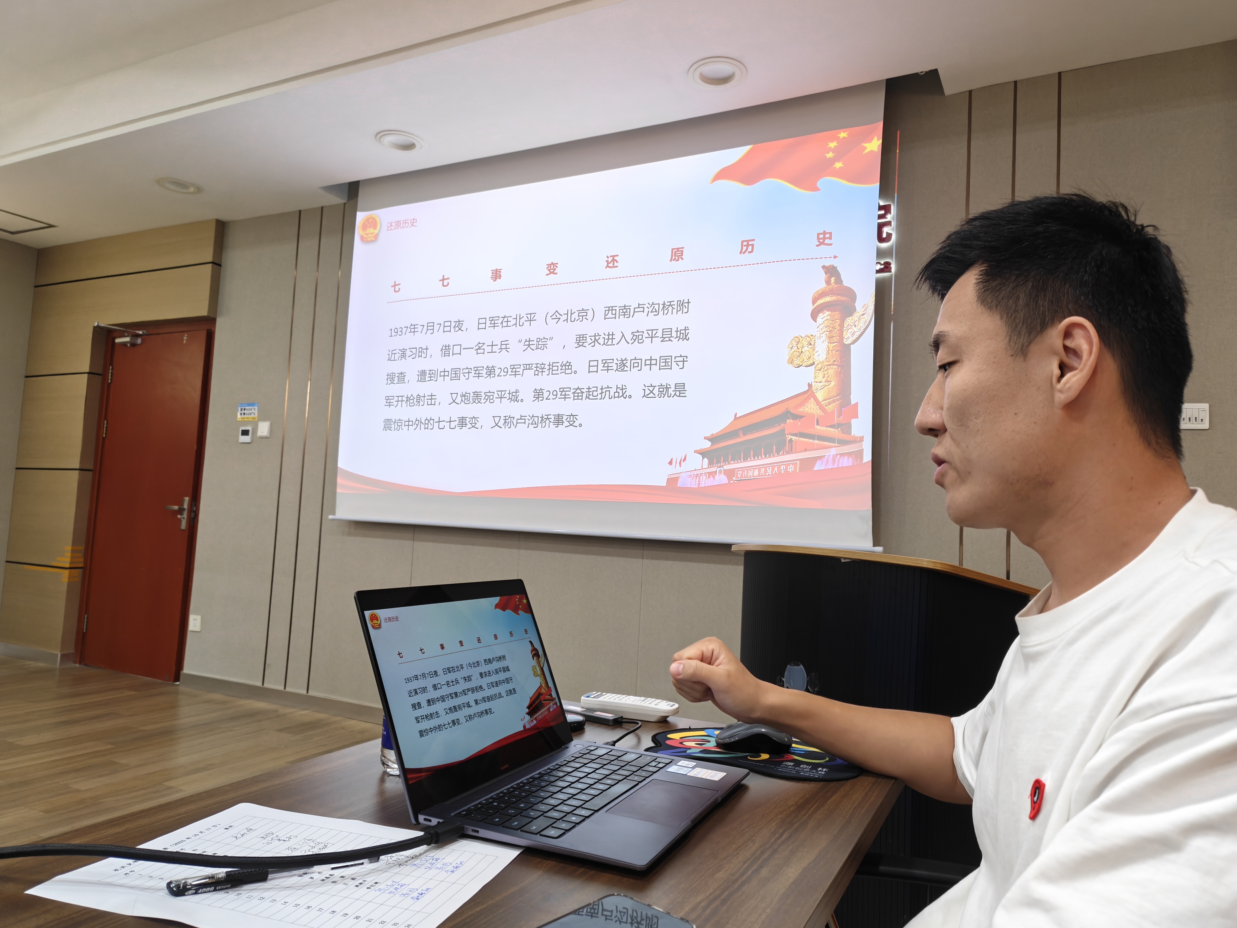 活动最后是支部传统的微党课环节。孙嘉择以《牢记历史,回顾七七事变》为题,带领大家回溯了那段民族奋起抗争的悲壮历史,深刻阐述了铭记国耻、自强不息的重大现实意义,激励大家从历史中汲取力量,立足岗位践行初心使命。李红艳以《中国国旗历史、由来与现实意义》为题,生动讲述了国旗的诞生历程、设计内涵及其所象征的伟大民族精神,深化了大家对国家象征的尊崇之情,增强了国家认同感和民族自豪感。